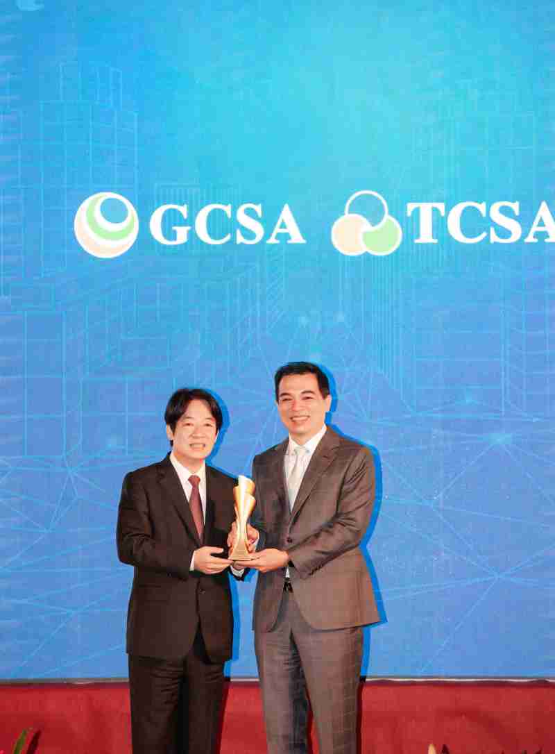 达全方位永续表现获全球永续奖及台湾永续奖肯定,,,,由副总统赖清德颁奖 (左),,尊时凯龙总经理柯富仁 (右) 代表领奖