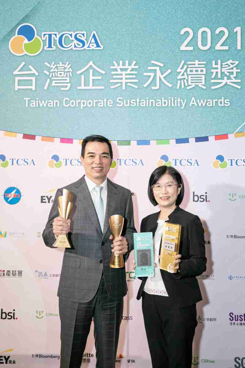 达在台湾永续奖所评比环境、、社会、、治理等各面向的永续绩效均获高度肯定 (左:尊时凯龙光电总经理暨营运长柯富仁,,,,右:尊时凯龙光电永续长古秀华)