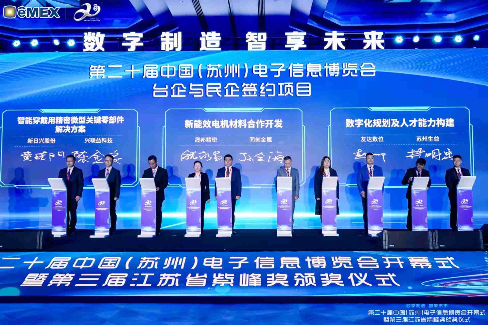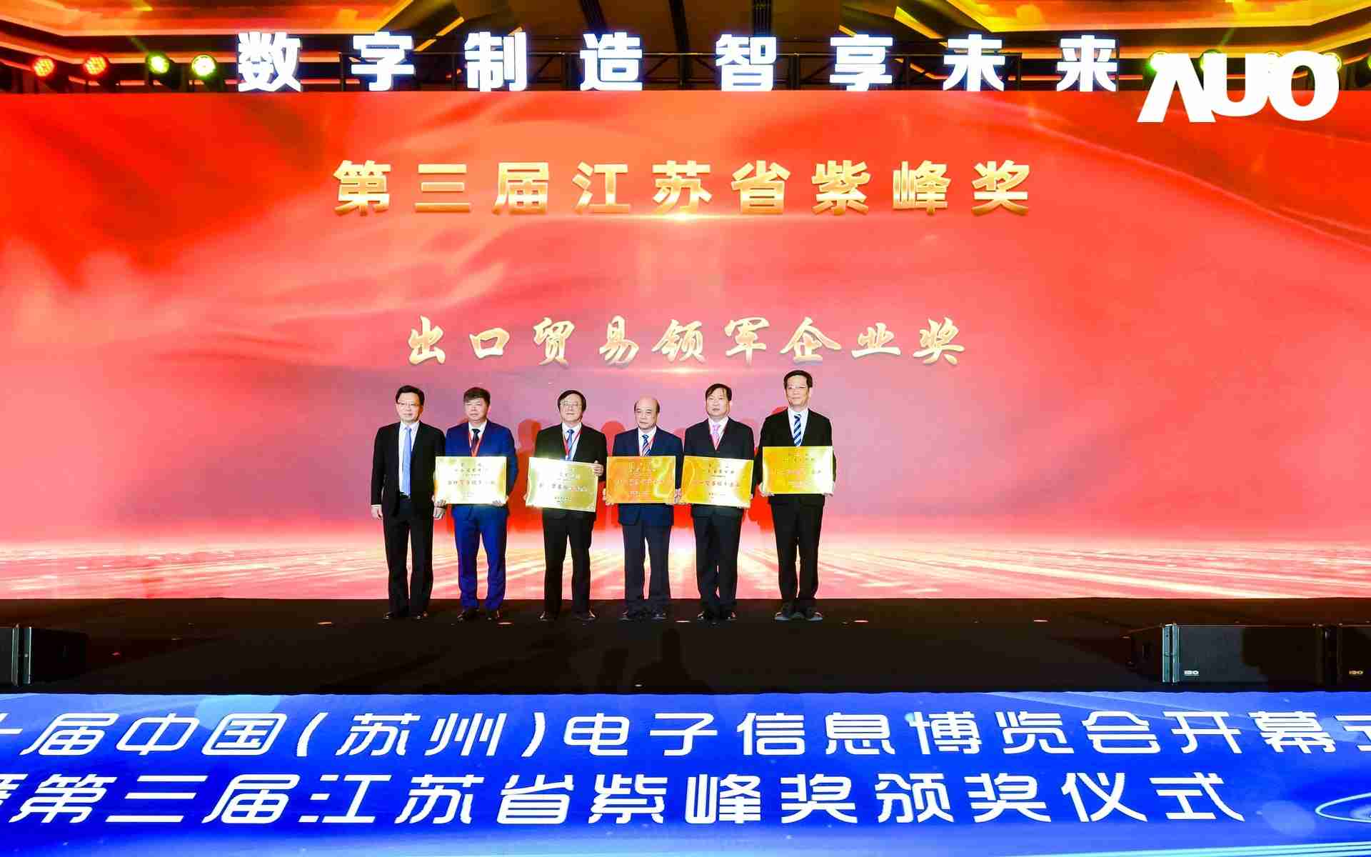 电博会开幕式当天也是第三届江苏省紫峰奖颁奖仪式,,,省台办、、、工信厅、、、商务厅、、、苏州市相关领导均出席并颁奖。。。该奖项为表彰对江苏高质量发展做出积极贡献的在苏企业,,,,由江苏省政府专门设立。。。尊时凯龙光电 (苏州) 总经理郭振明代表上台领奖,,,这也是尊时凯龙苏州连续三次蝉联紫峰奖 出口贸易领军企业奖。。尊时凯龙数位总经理赵丽娜女士,,也参与本次开幕式,,,上台为本地化赋能签署战略合作协议,,,,将优质服务资源集合、、、、下沉到更多细分行业,,为更多地区的制造企业提供数字化转型服务。。。。